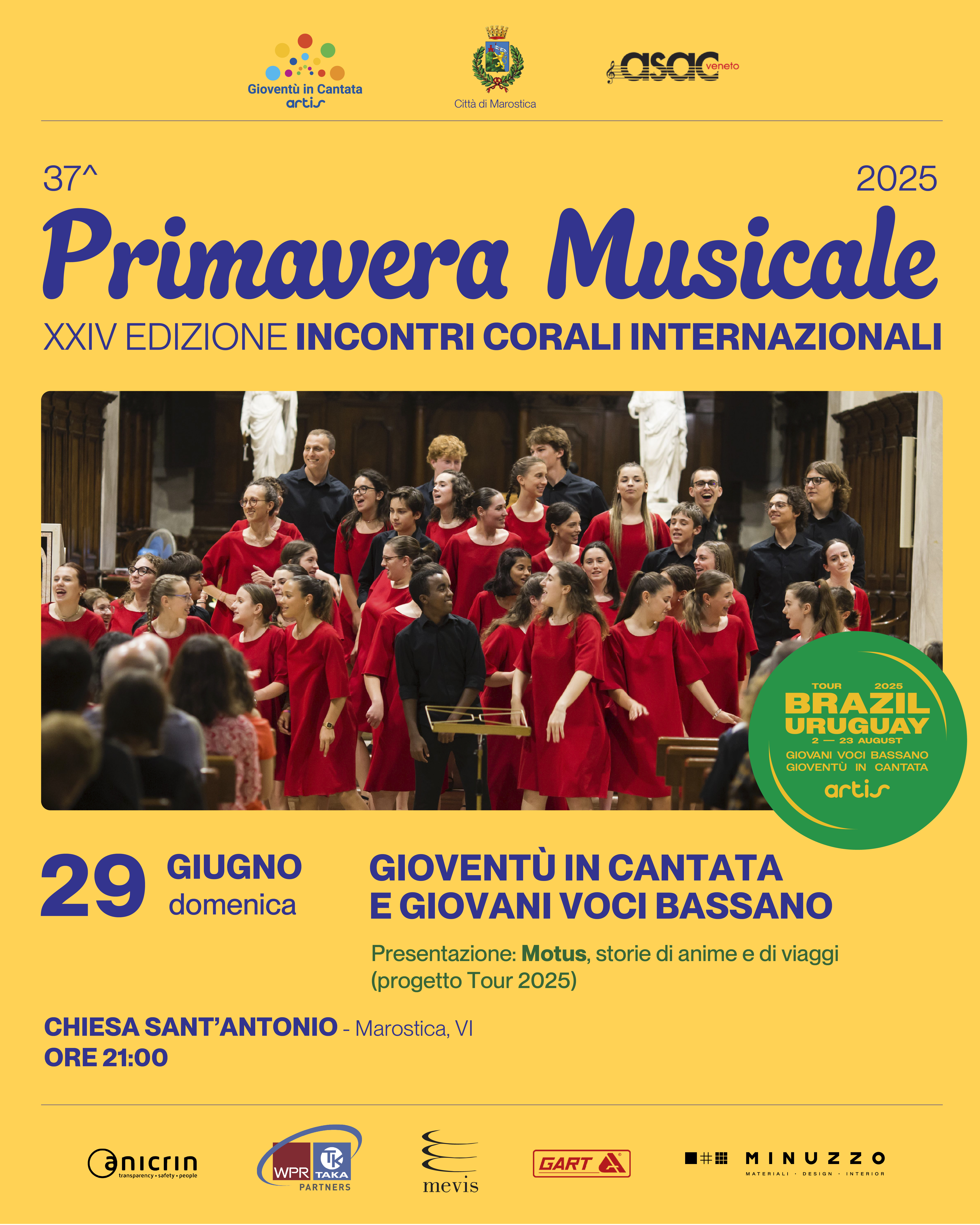 Si conclude con un evento di grande suggestione la 37ª edizione della Primavera Musicale: in scena il nuovo spettacolo "MOTUS – Storie di anime e di viaggi", un'esperienza corale intensa e coinvolgente, interpretata dalla formazione congiunta di Gioventù in Cantata e Giovani Voci Bassano.
