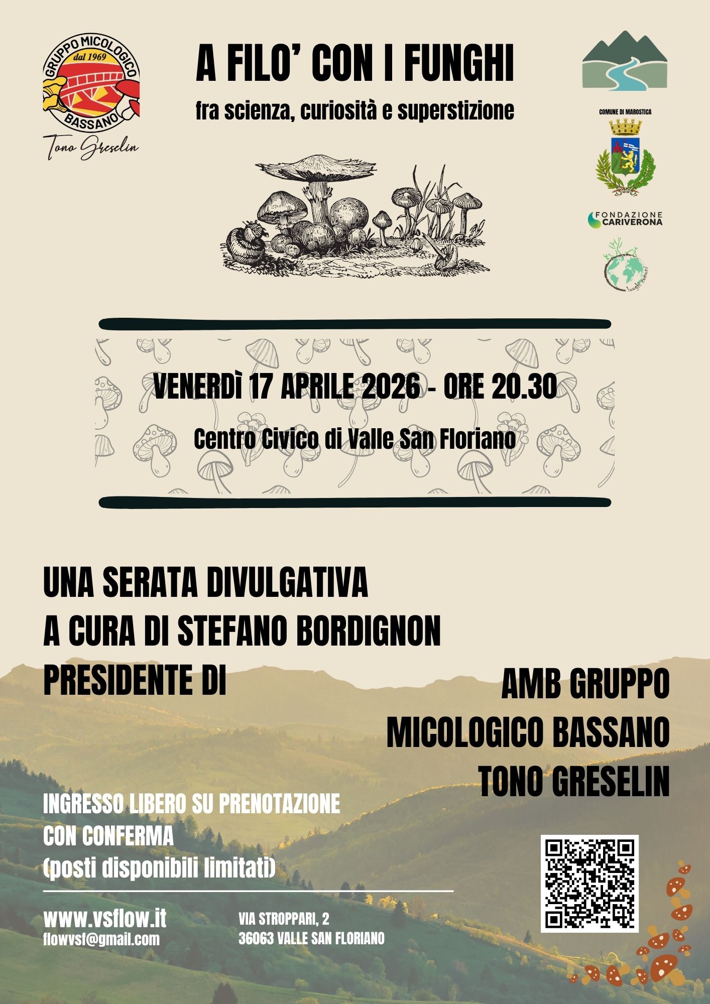 A filo' con i funghi - fra scienza, curiosità e superstizione. una serata divulgativa a cura di Stefano Bordignon, presidente di AMB gruppo micologico Bassano Toni Greselin. venerdì 17 aprile, alle ore 20:30 presso il centro civico di Valle San Floriano. Ingresso libero su prenotazione, vedi locandina